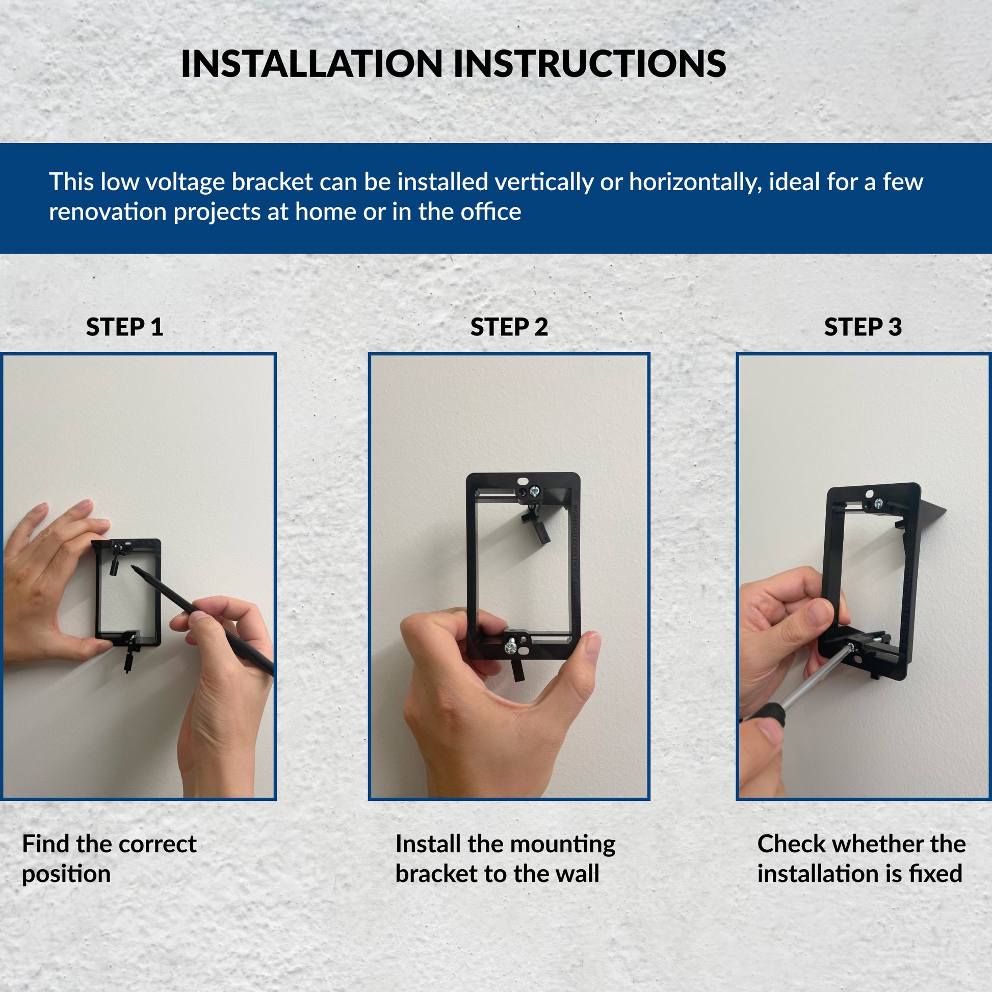 Looking for a reliable and easy-to-use solution for mounting your low voltage devices? Look no further than our 1 gang Low Voltage Mounting Bracket! Made of durable, non-metallic materials, this bracket is the perfect choice for adding phone jacks, data ports, and other low voltage devices to your walls. Its discreet design ensures a clean and professional look, while its easy installation process means you can get your devices up and running in no time. Trust us to provide the quality and reliability you need for all your low voltage mounting needs!